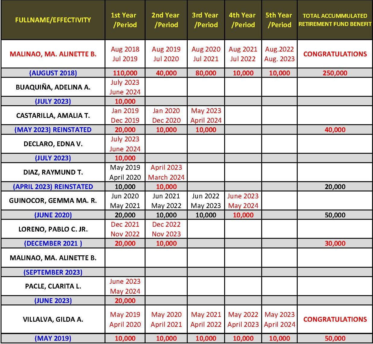 An EXECUTIVE DIRECTOR will receive RETIREMENT FUND BENEFIT of guaranteed P10,000.00 cash equivalent for every P25,000.00 GROSS GROUP SALES per month. The cash equivalent may double or triple depending on the maintained GGS at the minimum of P25,000.00 monthly for at least five (5) consecutive years.