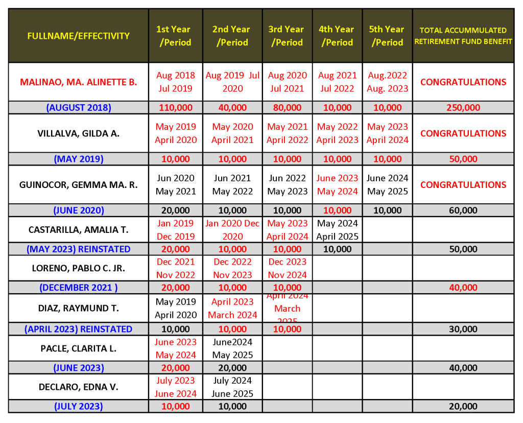 P400,000.00 x 5 yrs = P2,000,000.00 (Retirement Fund Benefit) assuming no increase of Monthly GGS for five (5) years.